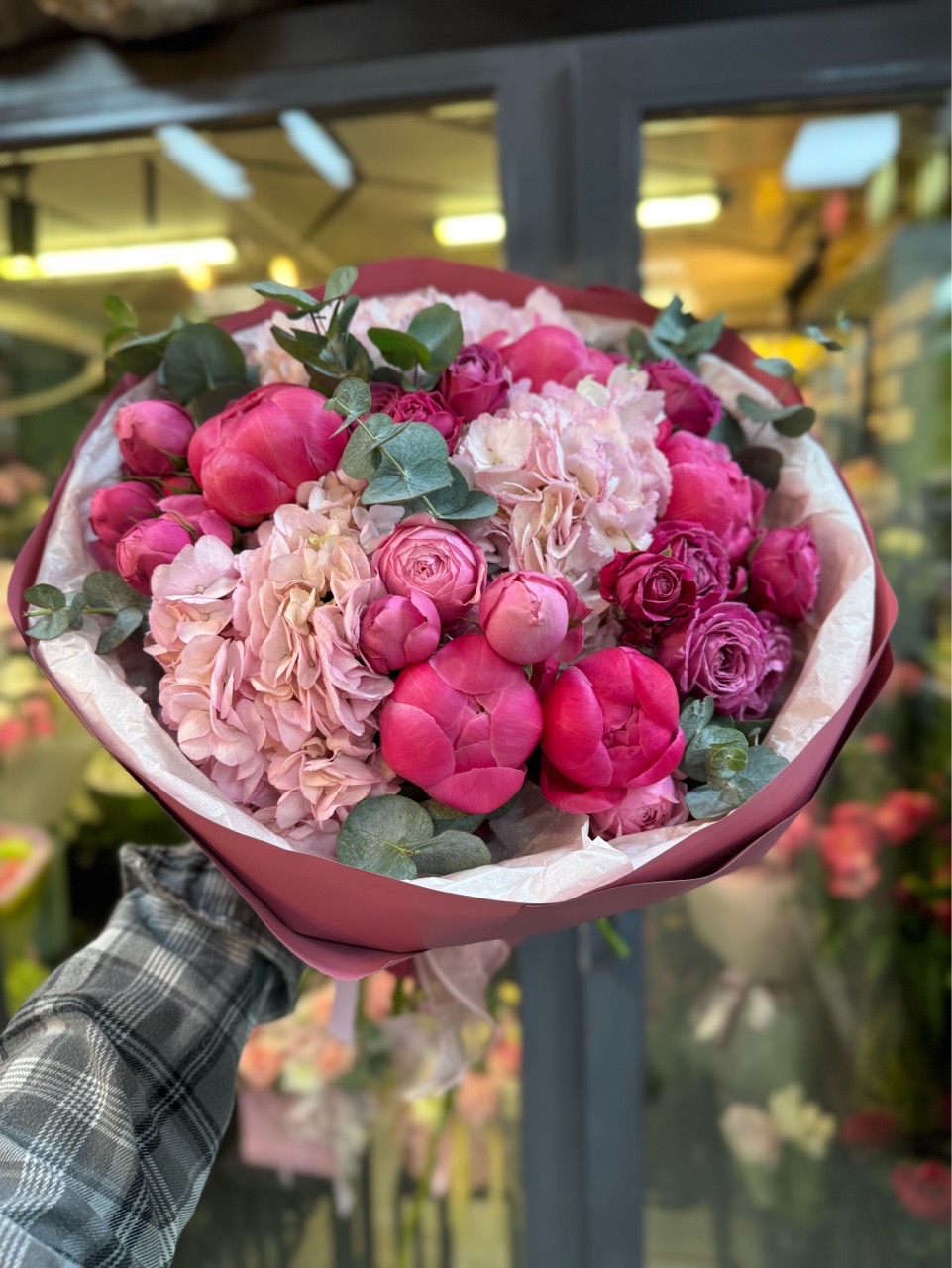 Букет в розово-брусничных оттенках с пионовидной кустовой розой, пионами и гортензией 😍